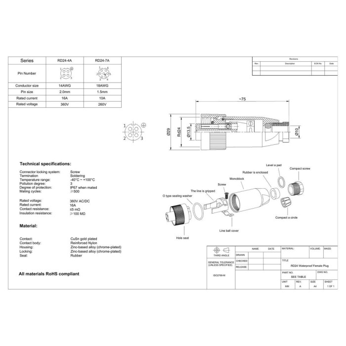 RD24 güç konnektörleri hem düşük maliyeti hem de kolay montaj özelliği ile güç uygulamalarına uygun çözümler sunmaktadır. 4 ve 7 kontak seçeneği olan RD 24 konnektör serisi IP67 koruma sınıfına sahiptir.