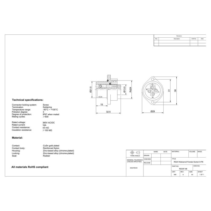 RD24 güç konnektörleri hem düşük maliyeti hem de kolay montaj özelliği ile güç uygulamalarına uygun çözümler sunmaktadır. 4 ve 7 kontak seçeneği olan RD 24 konnektör serisi IP67 koruma sınıfına sahiptir.